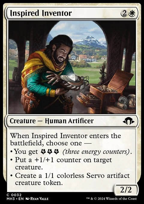 When this creature enters, choose one — • You get {E}{E}{E} (three energy counters). • Put a +1/+1 counter on target creature. • Create a 1/1 colorless Servo artifact creature token.