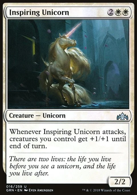 Whenever Inspiring Unicorn attacks, creatures you control get +1/+1 until end of turn.