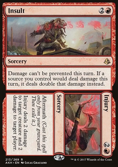 Insult Damage can't be prevented this turn. If a source you control would deal damage this turn, it deals double that damage instead. Injury Aftermath (Cast this spell only from your graveyard. Then exile it.) Injury deals 2 damage to target creature and 2 damage to target player or planeswalker.