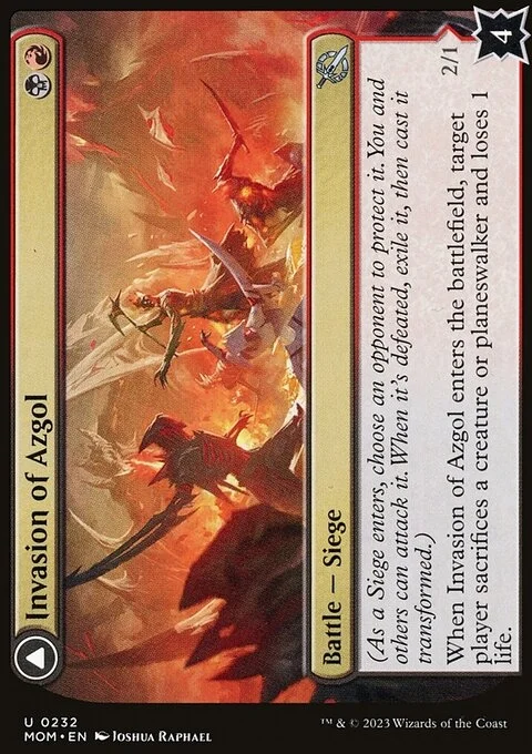 When Invasion of Azgol enters the battlefield, target player sacrifices a creature or planeswalker and loses 1 life.