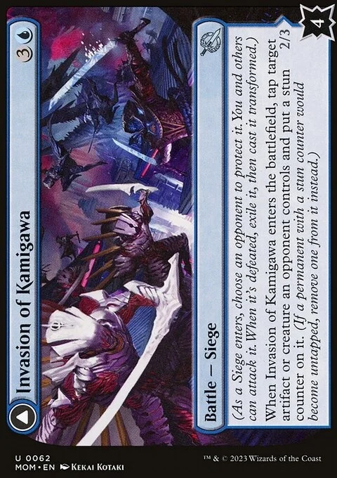 When Invasion of Kamigawa enters the battlefield, tap target artifact or creature an opponent controls and put a stun counter on it. (If a permanent with a stun counter would become untapped, remove one from it instead.)