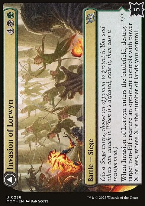 When Invasion of Lorwyn enters the battlefield, destroy target non-Elf creature an opponent controls with power X or less, where X is the number of lands you control.