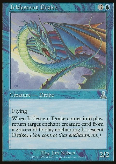 Flying, When Iridescent Drake comes into play, return target enchant creature card from a graveyard to play enchanting Iridescent Drake. (You control that enchantment.)