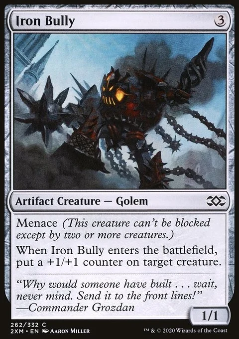 Menace (This creature can't be blocked except by two or more creatures.) When Iron Bully enters the battlefield, put a +1/+1 counter on target creature.