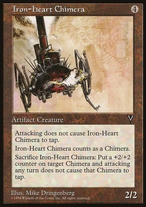 Attacking does not cause Iron-Heart Chimera to tap. Iron-Heart Chimera counts as a Chimera. Sacrifice Iron-Heart Chimera: Put a +2/+2 counter on target Chimera and attacking any turn does not cause that Chimera to tap.