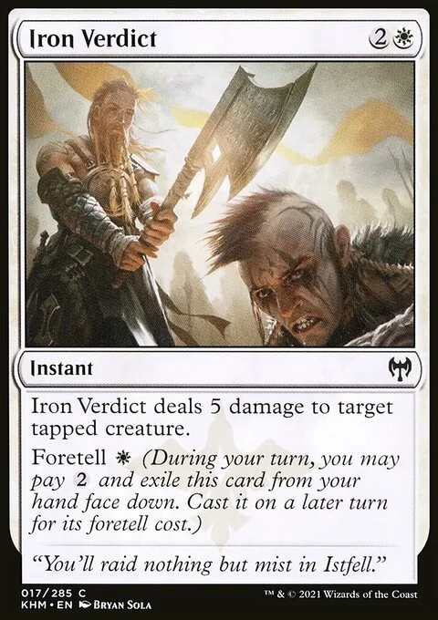 Iron Verdict deals 5 damage to target tapped creature. Foretell {W} (During your turn, you may pay {2} and exile this card from your hand face down. Cast it on a later turn for its foretell cost.)