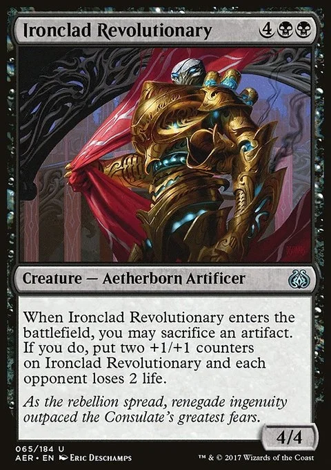 When Ironclad Revolutionary enters the battlefield, you may sacrifice an artifact. If you do, put two +1/+1 counters on Ironclad Revolutionary and each opponent loses 2 life.