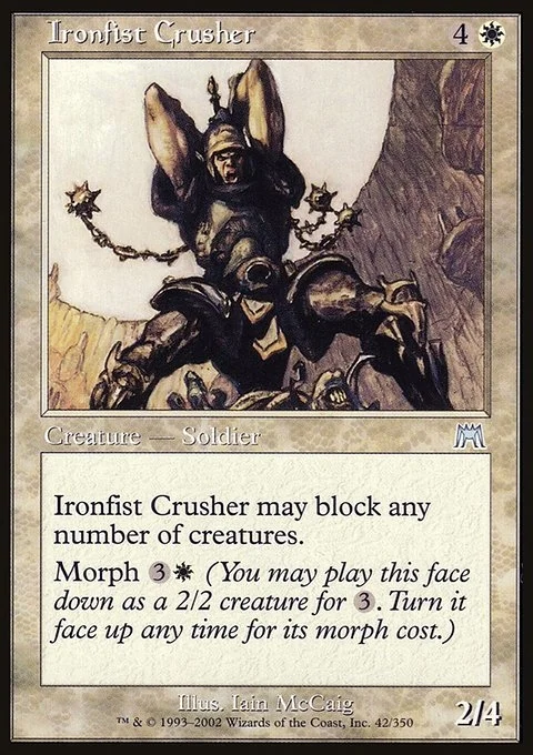 Ironfist Crusher can block any number of creatures. Morph {3}{W} (You may cast this card face down as a 2/2 creature for {3}. Turn it face up any time for its morph cost.)