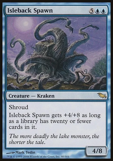 Shroud (This creature can't be the target of spells or abilities.) Isleback Spawn gets +4/+8 as long as a library has twenty or fewer cards in it.