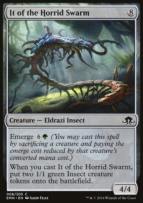 Emerge {6}{G} (You may cast this spell by sacrificing a creature and paying the emerge cost reduced by that creature's mana value.) When you cast this spell, create two 1/1 green Insect creature tokens.