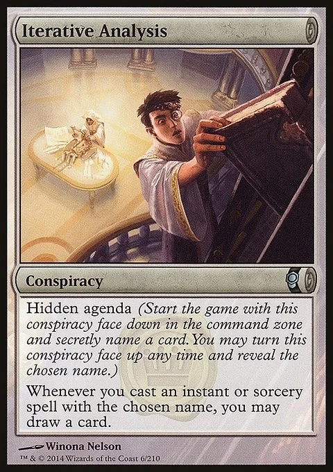 Hidden agenda (Start the game with this conspiracy face down in the command zone and secretly choose a card name. You may turn this conspiracy face up any time and reveal that name.) Whenever you cast an instant or sorcery spell with the chosen name, you may draw a card.