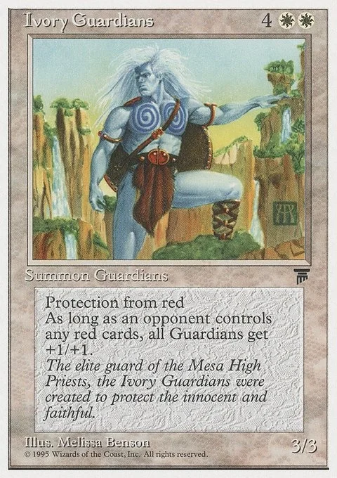 Protection from redAs long as an opponent controls any red cards, all Guardians get +1/+1.