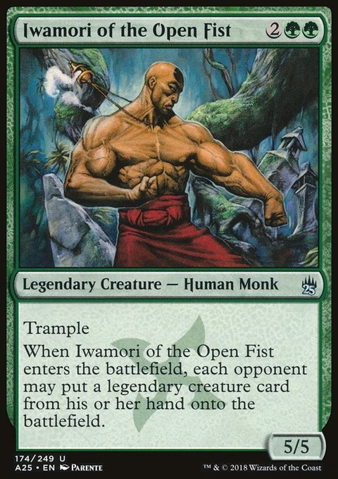 Trample When Iwamori of the Open Fist enters the battlefield, each opponent may put a legendary creature card from their hand onto the battlefield.
