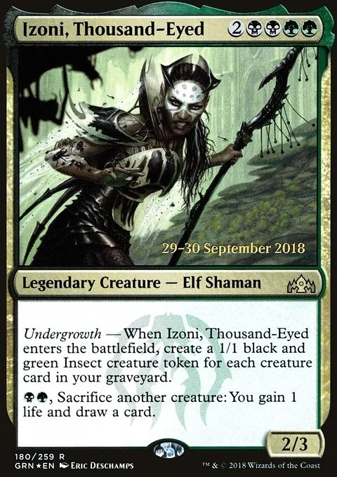 Undergrowth — When Izoni enters, create a 1/1 black and green Insect creature token for each creature card in your graveyard. {B}{G}, Sacrifice another creature: You gain 1 life and draw a card.