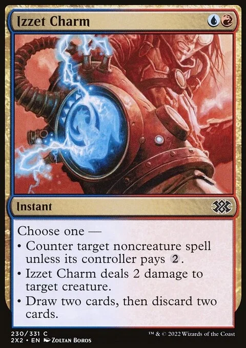 Choose one — • Counter target noncreature spell unless its controller pays {2}. • Izzet Charm deals 2 damage to target creature. • Draw two cards, then discard two cards.