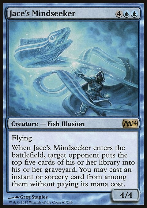 Flying When Jace's Mindseeker enters the battlefield, target opponent puts the top five cards of their library into their graveyard. You may cast an instant or sorcery card from among them without paying its mana cost.