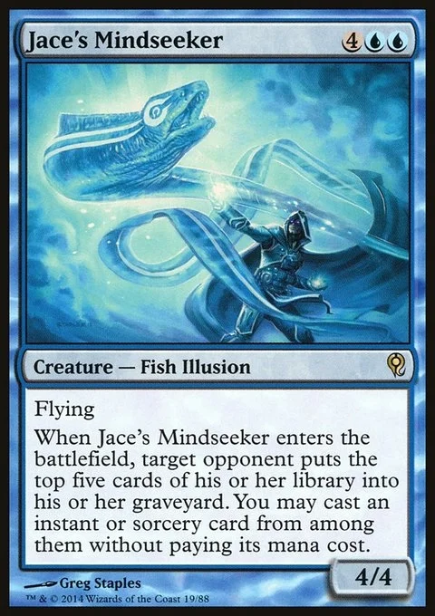 Flying When Jace's Mindseeker enters the battlefield, target opponent puts the top five cards of their library into their graveyard. You may cast an instant or sorcery card from among them without paying its mana cost.