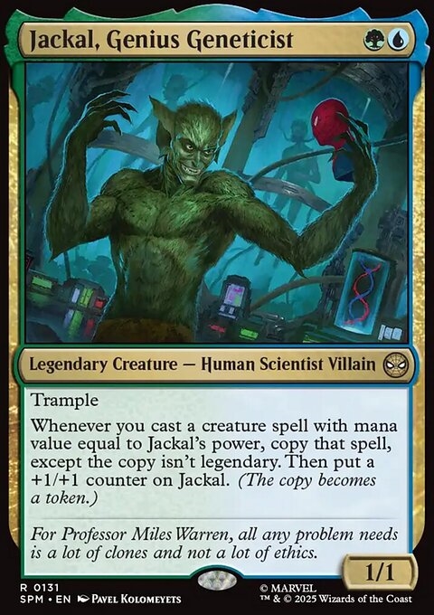 Trample Whenever you cast a creature spell with mana value equal to Jackal's power, copy that spell, except the copy isn't legendary. Then put a +1/+1 counter on Jackal. (The copy becomes a token.)