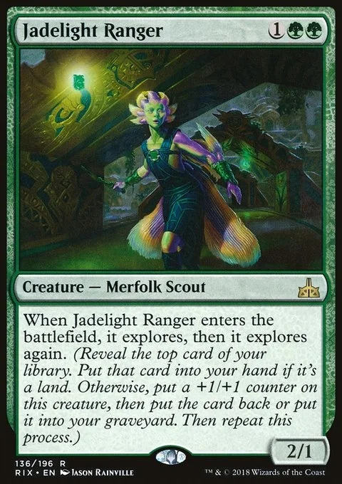 When Jadelight Ranger enters the battlefield, it explores, then it explores again. (Reveal the top card of your library. Put that card into your hand if it's a land. Otherwise, put a +1/+1 counter on this creature, then put the card back or put it into your graveyard. Then repeat this process.)