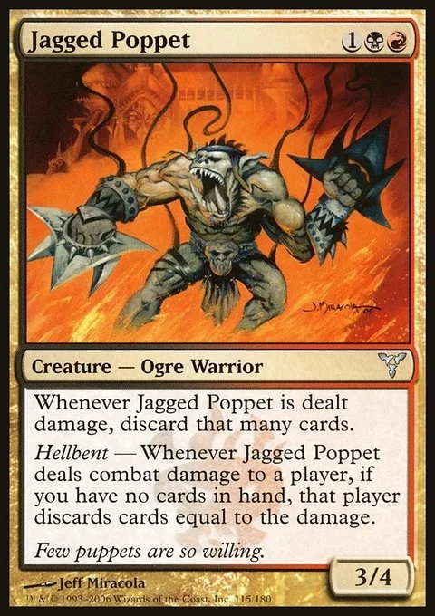 Whenever Jagged Poppet is dealt damage, discard that many cards. Hellbent — Whenever Jagged Poppet deals combat damage to a player, if you have no cards in hand, that player discards cards equal to the damage.