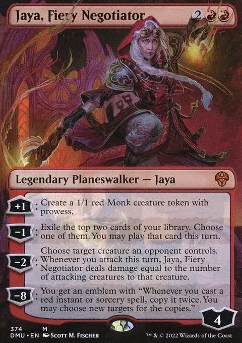 +1: Create a 1/1 red Monk creature token with prowess. -1: Exile the top two cards of your library. Choose one of them. You may play that card this turn. -2: Choose target creature an opponent controls. Whenever you attack this turn, Jaya deals damage equal to the number of attacking creatures to that creature. -8: You get an emblem with "Whenever you cast a red instant or sorcery spell, copy it twice. You may choose new targets for the copies."