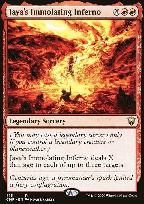 (You may cast a legendary sorcery only if you control a legendary creature or planeswalker.) Jaya's Immolating Inferno deals X damage to each of up to three targets.