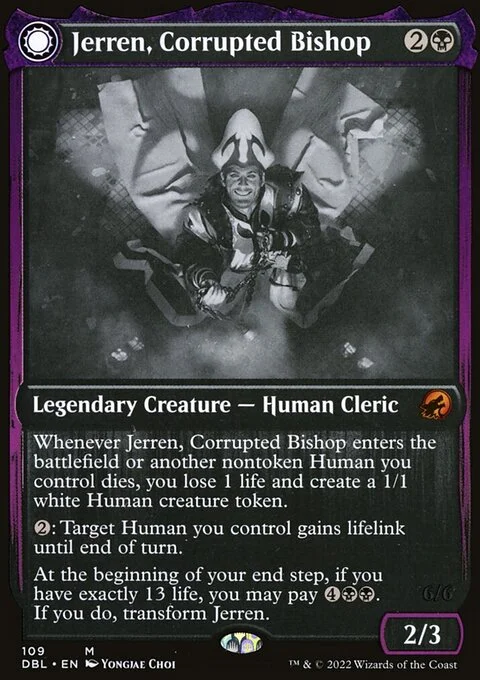At the beginning of your end step, if you have exactly 13 life, you may pay {4}{B}{B}. If you do, transform Jerren.
