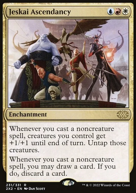 Whenever you cast a noncreature spell, creatures you control get +1/+1 until end of turn. Untap those creatures. Whenever you cast a noncreature spell, you may draw a card. If you do, discard a card.