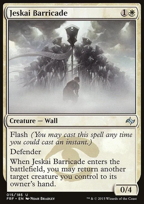 Flash (You may cast this spell any time you could cast an instant.) Defender When Jeskai Barricade enters the battlefield, you may return another target creature you control to its owner's hand.