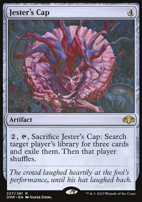 {2}, {T}, Sacrifice Jester's Cap: Search target player's library for three cards and exile them. Then that player shuffles.