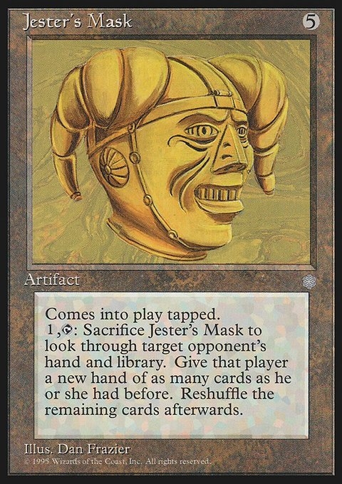 Comes into play tapped. 1, T: Sacrifice Jester’s Mask to look through target opponent’s hand and library. Give that player a new hand of as many cards as he or she had before. Reshuffle the remaining cards afterwards.
