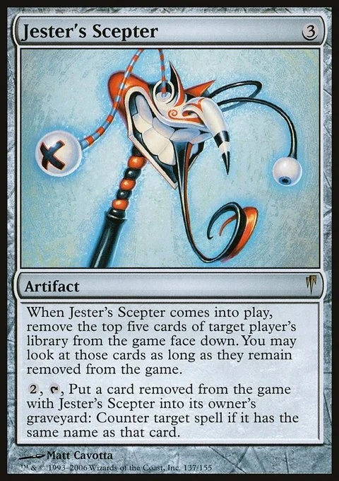 When Jester's Scepter enters the battlefield, exile the top five cards of target player's library face down. You may look at those cards for as long as they remain exiled.