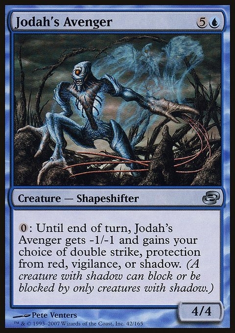 0: Until end of turn, Jodah's Avenger gets -1/-1 and gains your choice of double strike, protection from red, vigilance, or shadow. (A creature with shadow can block or be blocked by only creatures with shadow.)