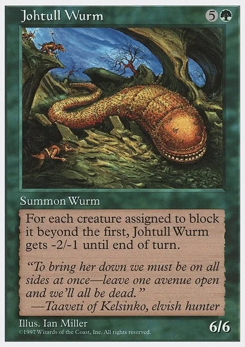 For each creature assigned to block it beyond the first, Johtull Wurm gets -2/-1 until end of turn.