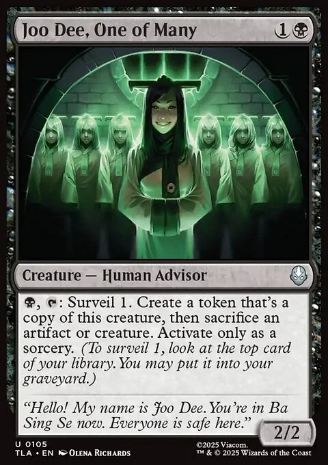 {B}, {T}: Surveil 1. Create a token that's a copy of this creature, then sacrifice an artifact or creature. Activate only as a sorcery. (To surveil 1, look at the top card of your library. You may put it into your graveyard.)