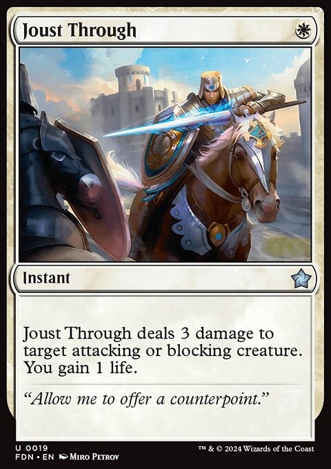 Joust Through deals 3 damage to target attacking or blocking creature. You gain 1 life.