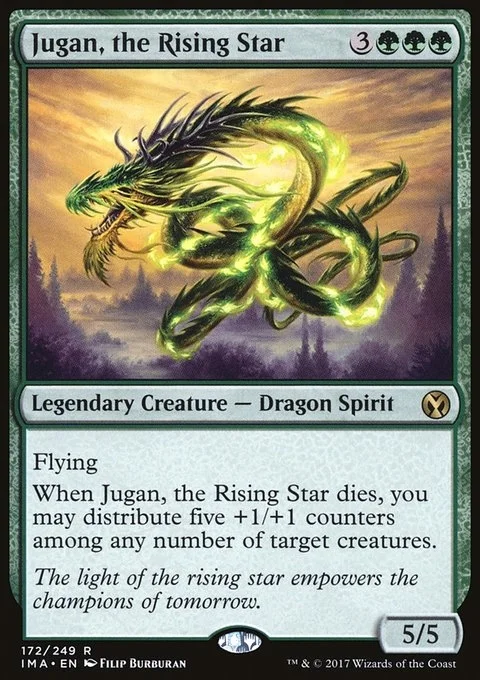 Flying When Jugan, the Rising Star dies, you may distribute five +1/+1 counters among any number of target creatures.