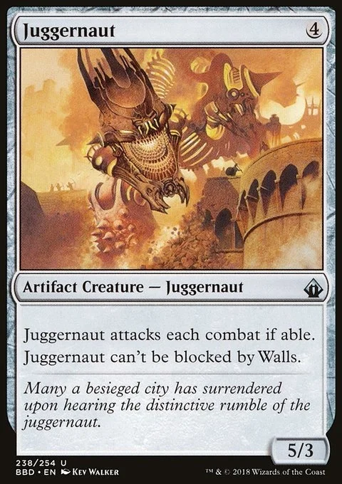 Juggernaut attacks each combat if able. Juggernaut can't be blocked by Walls.