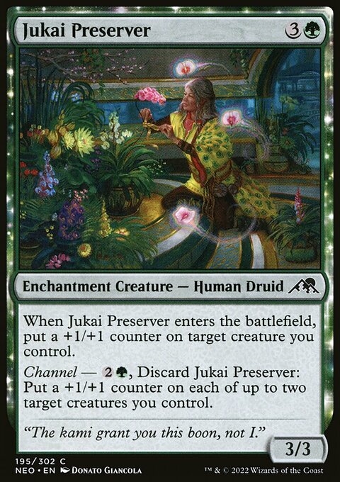 When this creature enters, put a +1/+1 counter on target creature you control. Channel — {2}{G}, Discard this card: Put a +1/+1 counter on each of up to two target creatures you control.