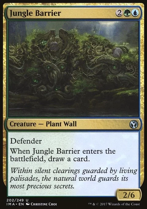 Defender (This creature can't attack.) When Jungle Barrier enters the battlefield, draw a card.