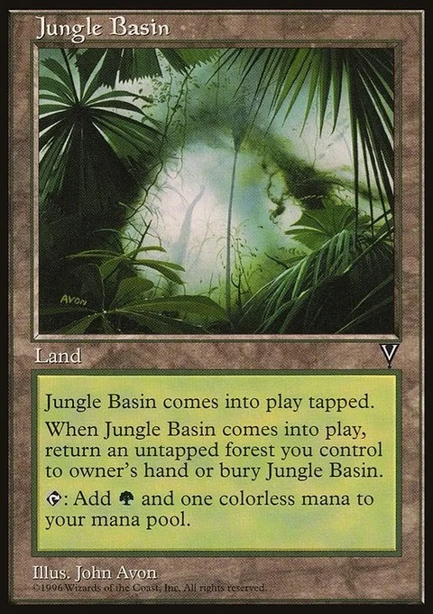 Jungle Basin comes into play tapped. When Jungle Basin comes into play, return an untapped forest you control to owner’s hand or bury Jungle Basin. T: Add G and one colorless mana to your mana pool.