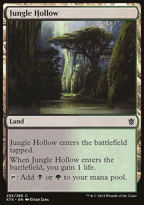 Jungle Hollow enters the battlefield tapped. When Jungle Hollow enters the battlefield, you gain 1 life. {T}: Add {B} or {G}.