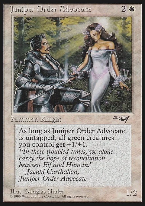 As long as Juniper Order Advocate is untapped, all green creatures you control get +1/+1.