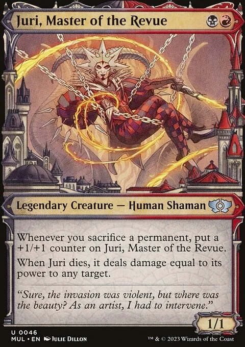 Whenever you sacrifice a permanent, put a +1/+1 counter on Juri, Master of the Revue. When Juri dies, it deals damage equal to its power to any target.
