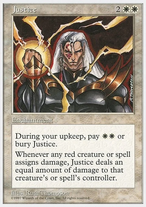 During your upkeep, pay WW or bury Justice.Whenever any red creature or spell assigns damage, Justice deals an equal amount of damage to that creature’s or spell’s controller.
