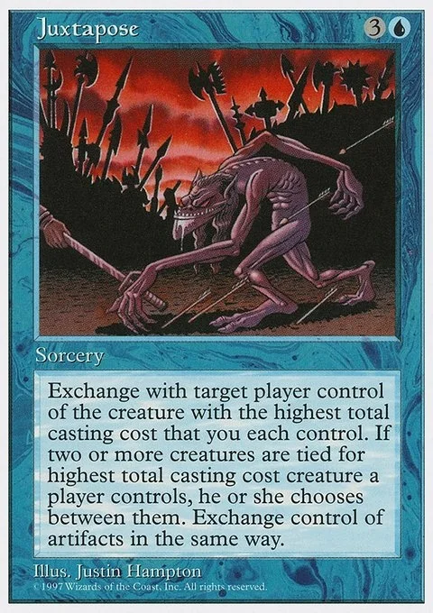 Exchange with target player control of the creature with the highest total casting cost that you each control. If two or more creatures are tied for highest total casting cost creature a player controls, he or she chooses between them. Exchange control of artifacts in the same way.