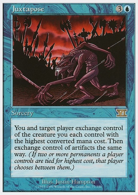 You and target player exchange control of the creature you each control with the highest converted mana cost. Then exchange control of artifacts the same way. (If two or more permanents a player controls are tied for highest cost, that player chooses between them.)