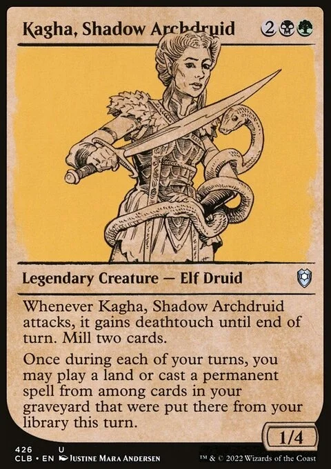 Whenever Kagha, Shadow Archdruid attacks, it gains deathtouch until end of turn. Mill two cards. (Put the top two cards of your library into your graveyard.)