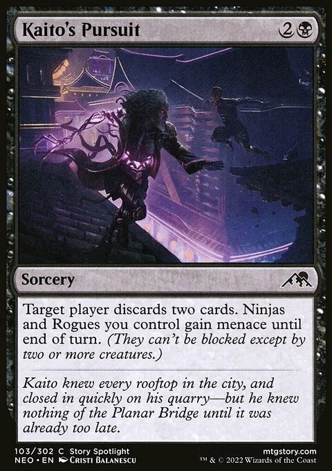 Target player discards two cards. Ninjas and Rogues you control gain menace until end of turn. (They can't be blocked except by two or more creatures.)