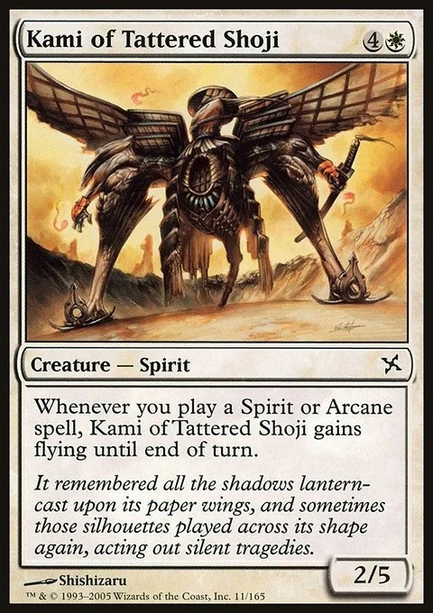 Whenever you cast a Spirit or Arcane spell, Kami of Tattered Shoji gains flying until end of turn.